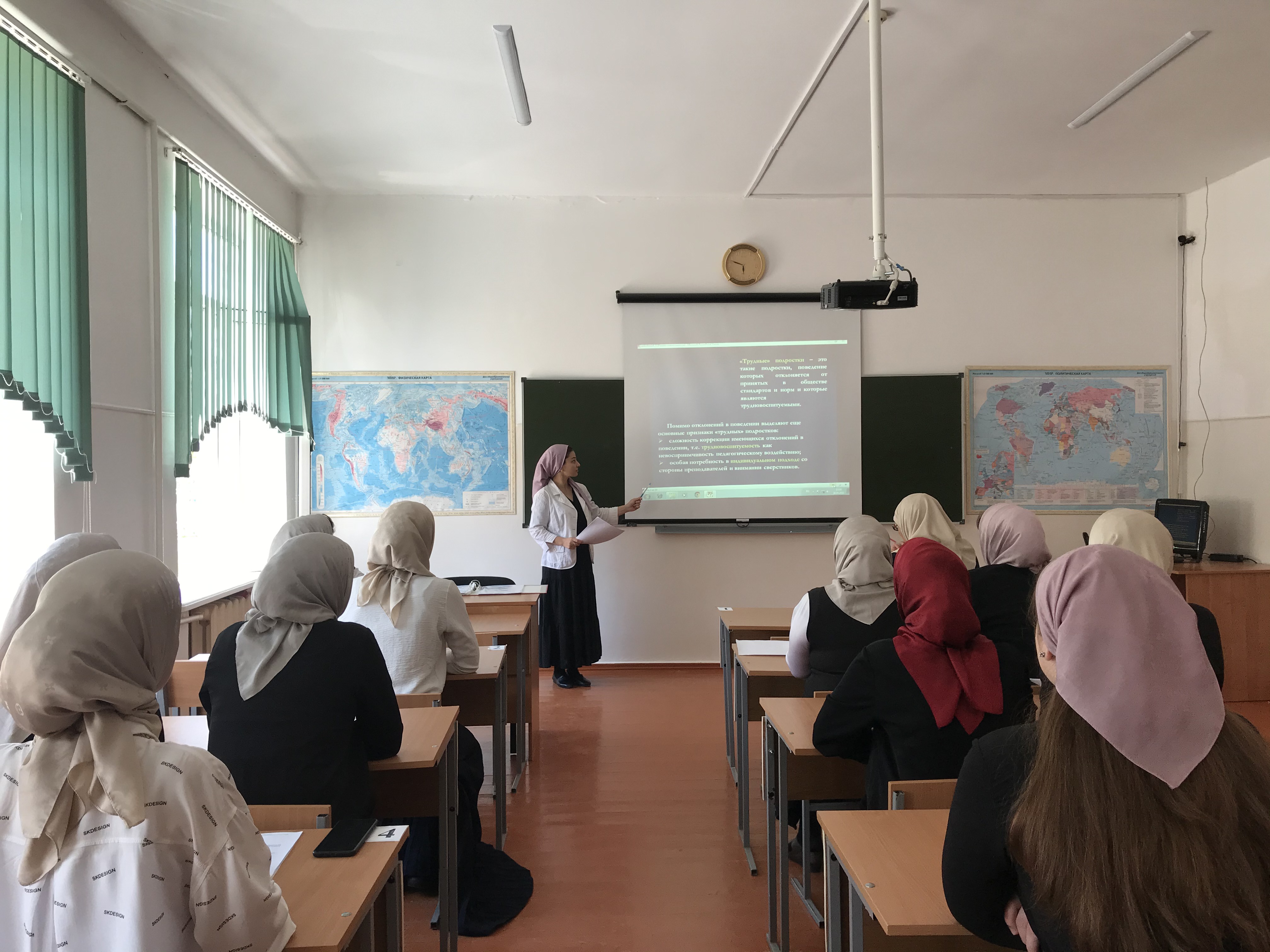 26.04.2021Заместитель директора по ВР Гунашева М.Ч. , педагог- психолог Аслаханова И.Р. провели семинар для педагогических работников на тему: " Девиантное поведение подростков- причины и способы преодоления".