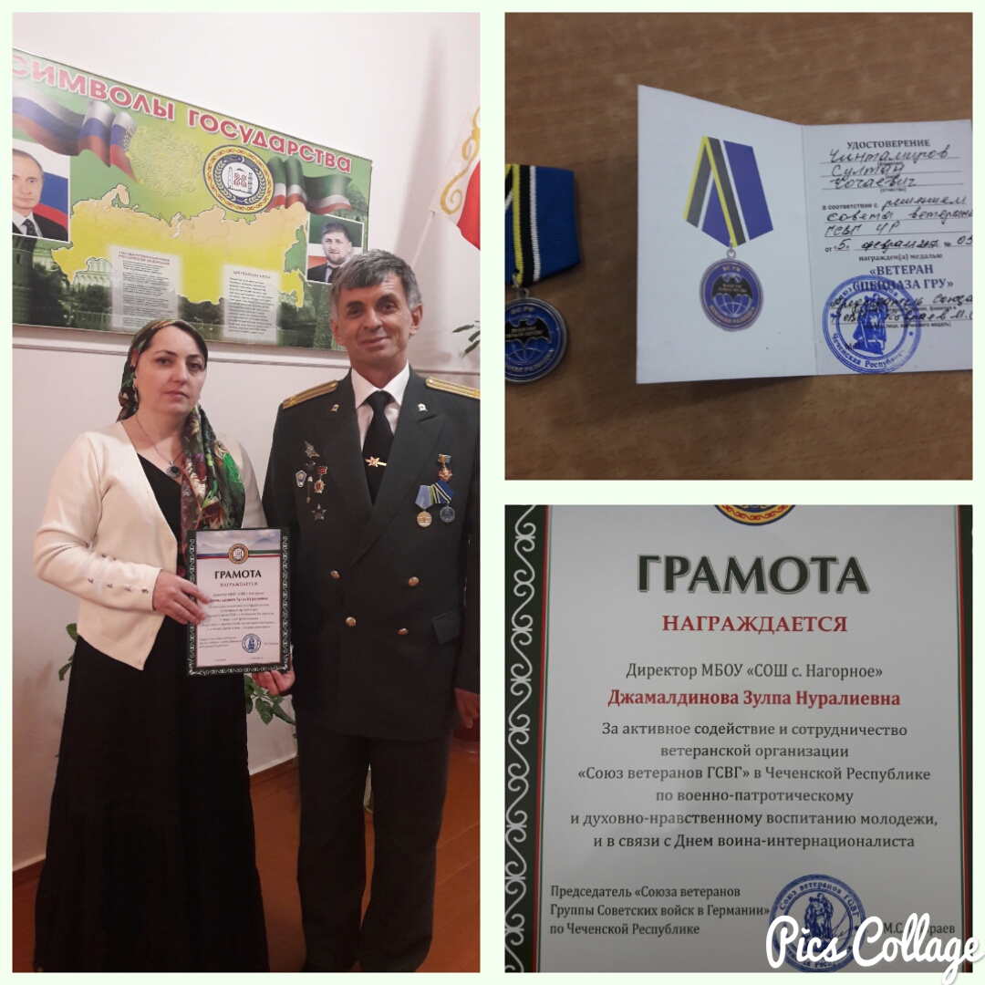 Решением "Союза ветеранов ГСВГ" по ЧР Ковраев М.С. отметил работу директора школы Джамалдиновой З.Н. по военно-патриотическому и духовно-нравственному воспитанию молодежи вручением грамоты.