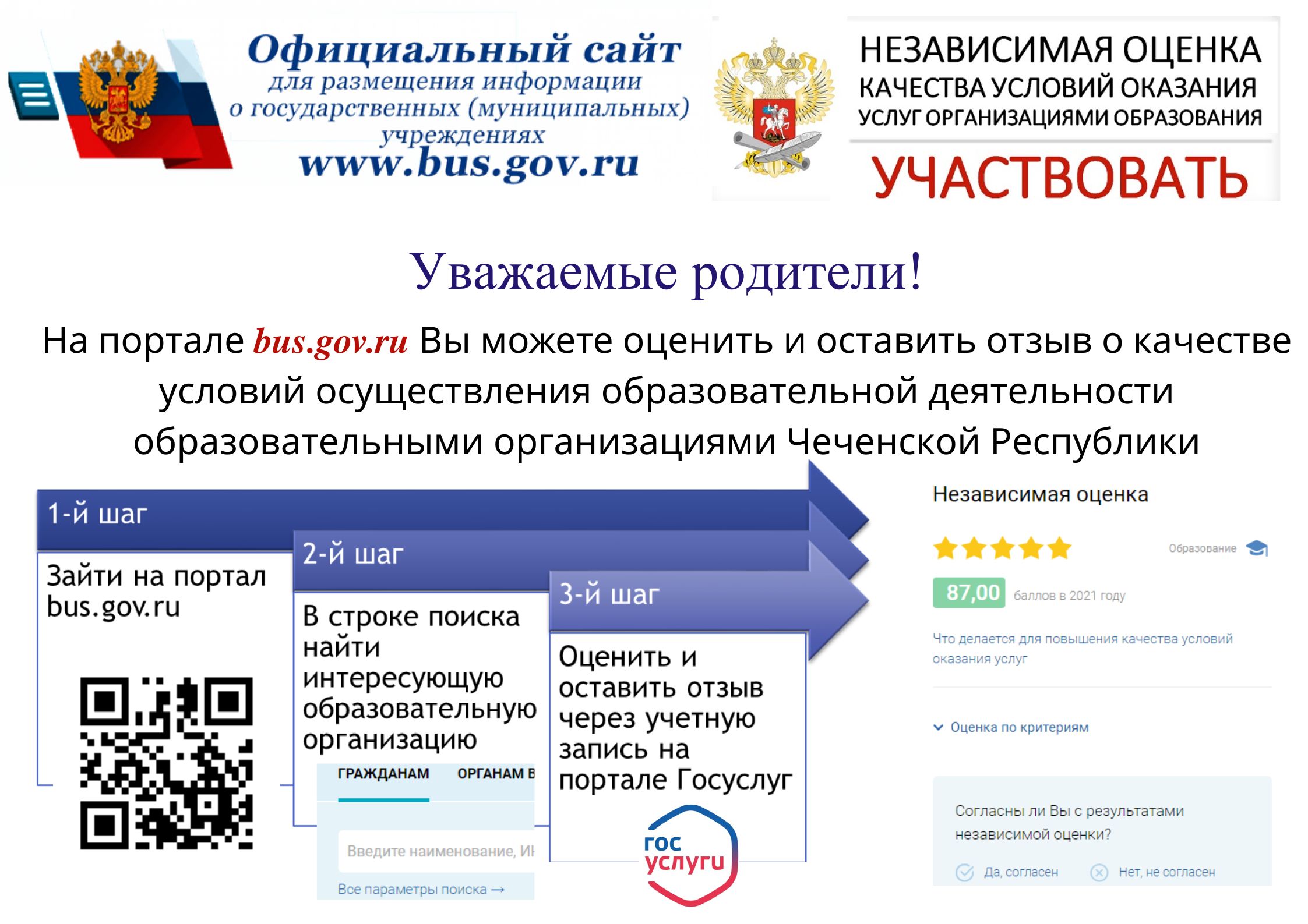 Также информируем, что опробовать новое приложение можно, проголосовав и оставив отзыв об образовательных организациях, в отношении которых запланирована независимая оценка качества условий осуществления образовательной деятельности в 2022 году. Перечень таких организаций, утвержденный Министерством образования, опубликован на сайте www.bus.gov.ru.