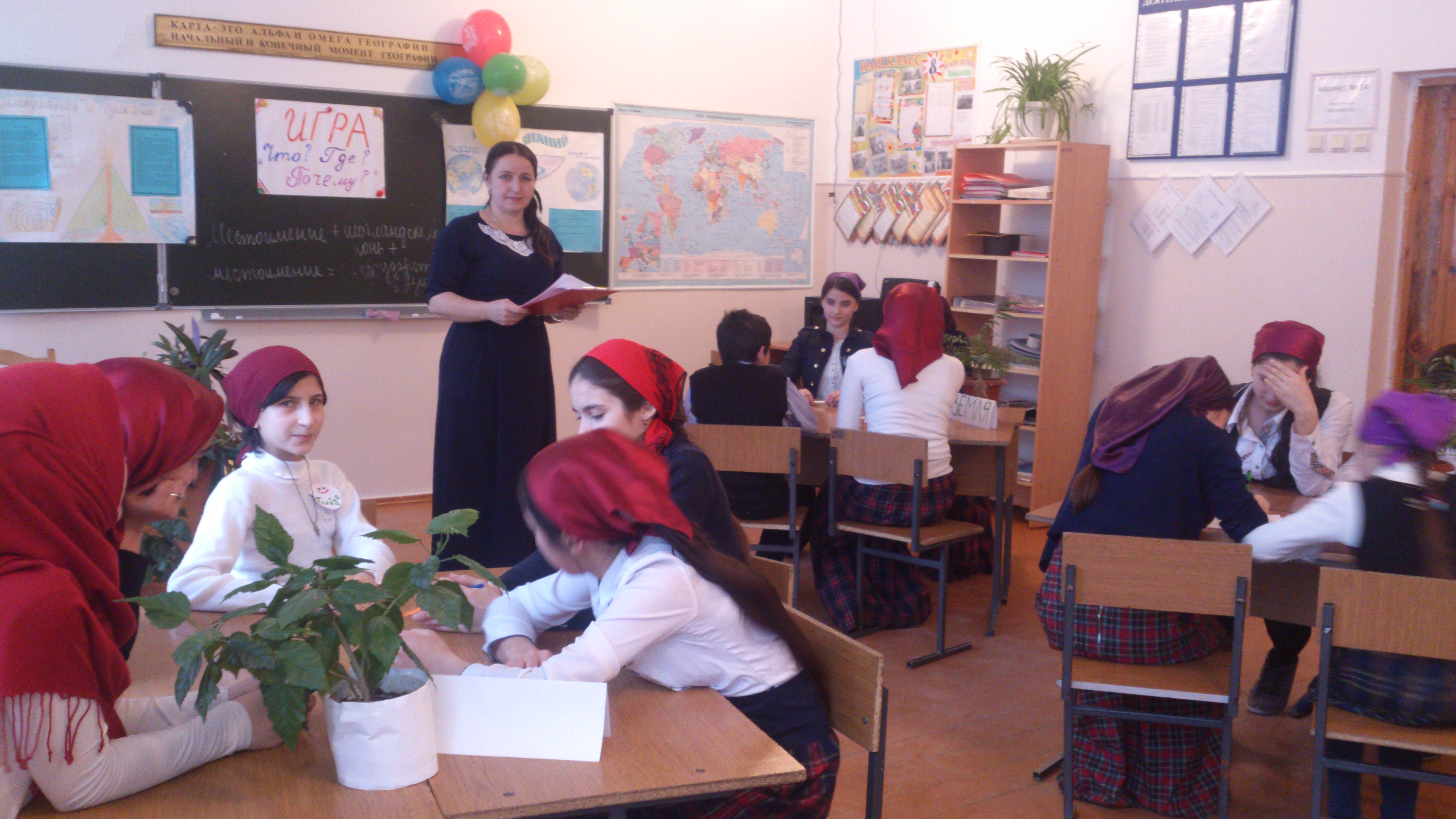 11.02.2015В рамках предметной недели естественного цикла учителем географии Арсанукаевой Л.Б. проведена интеллектуально-познавательная игра по географии« Что? Где? Почему? ». Участники мероприятия учащиеся 7-9 классов.
