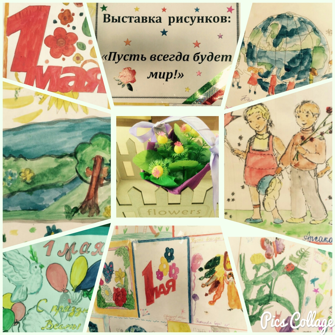 Выставка рисунков: "Пусть всегда будет мир!", посвященная празднику Весны и Труда.