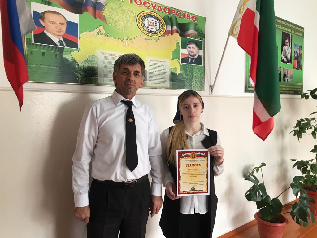 08.03.2018Ученица 11 класса МБОУ "СОШ с. Нагорное" Саламова Малика награждена грамотой за активное участие в общественной жизни школы и военно-патриотических мероприятиях "Союза ветеранов Группы войск в Германии" председателем ГСВГ по Чеченской Республике М.С. Ковраевым.