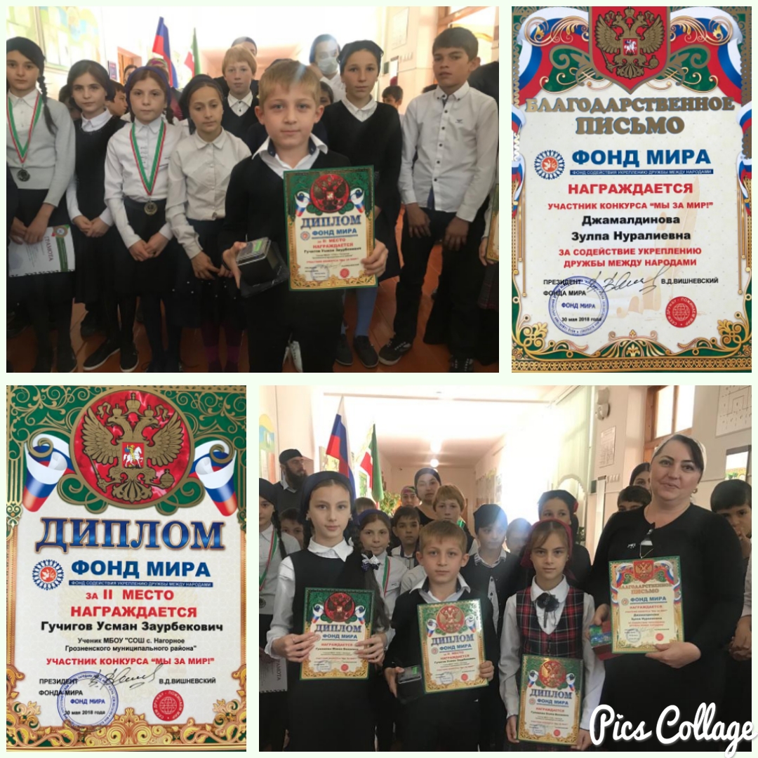 30.10.2018Учащиеся МБОУ "СОШ с. Нагорное"приняли участие в конкурсе "Мы за Мир!", организованном Фондом мира. Ученик 3 класса Гучигов Усман занял II по СКФО. Награжден ценными призами и грамотой. Так же награждены- ученица 3 класса Гунашева Йисита, ученица 6 класса Гунашева Макка за участие в конкурсе. Награждена директор школы Джамалдинова З.Н. "За содействие укреплению дружбы между народами".